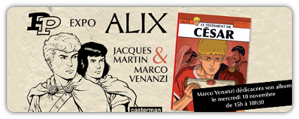 Jusqu'au 4 décembre, la galerie Petit Papiers à Paris propose une exposition-vente de plus de quarante originaux des albums d'Alix, adapté en série animée à la fin des années 1990 pour France 3 . Il s'agit des aventures d'un jeune Gallo-Romain qui parcourt l'Empire romain environ cinquante ans avant notre ère et qui connait de nombreuses aventures. La première histoire du héros créé par Jacques Martin est apparue en 1948 dans le Journal de Tintin, deux ans après la création de ce dernier. Il y paraitra jusqu'en 1985, malgré le départ de Jacques Martin des studios Hergé en 1972. Quelques années après le mouvement étudiant de mai 1968, ce changement offrit la liberté d'aborder des sujets plus adultes. Malgré la mort de son auteur au début de cette année, les aventures continuent grâce aux collaborateurs formés au fil des ans. Le 29e album de la série est sorti en octobre dernier.