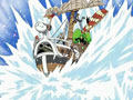 Luffy décide de se battre contre la baleine et finalement lui promet qu'il reviendra plus tard finir ce combat. En dessinant le drapeau du Vogue Merry sur son front, il sauve la vie de Laboon, la dissuadant ainsi de se cogner la tête contre l'immense montagne... |
