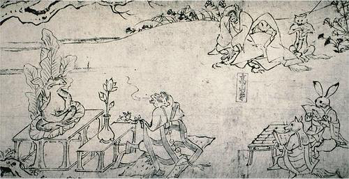 Parmi ces emakimono, il faut remarquer le Chôjû-jinbutsu-giga (« caricatures de personnage de la faune »), traitant d’animaux anthropomorphes. Dans celui-là, il n’y a pas de texte pour aller avec l’image, celle-ci se suffisant à elle-même. La signification exacte de ces dessins est donc très incertaine. Mais il semblerait que ce soit une satire des moines et aristocrates de l’époque, d’où l’absence de texte pour éviter toute censure (l’auteur de ces rouleaux est sujet à débats).
